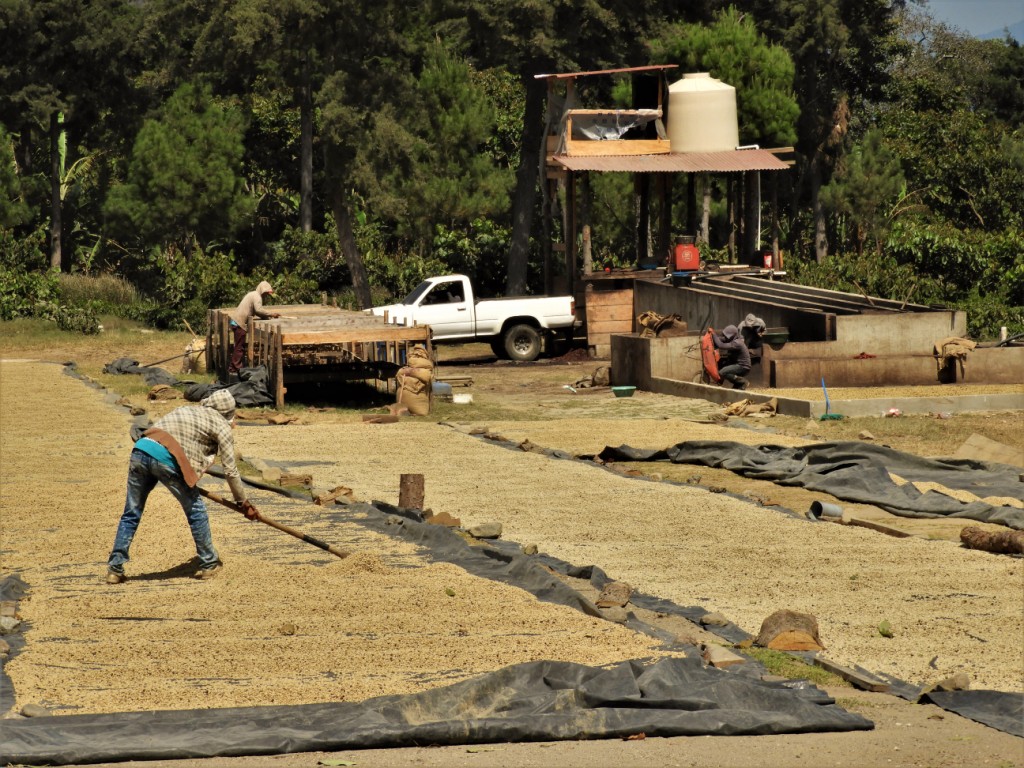 Nous poursuivons la longue route qui contourne le lac par l’ouest. Au sud, nous rencontrons les ouvriers appliqués à faire sécher le café qui apprécie le climat frais des bords du lac.