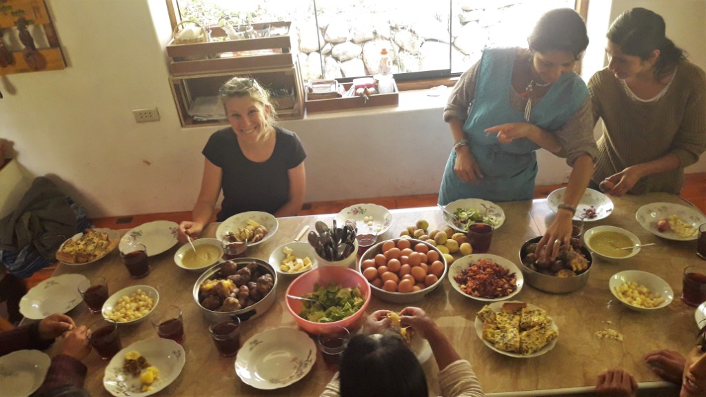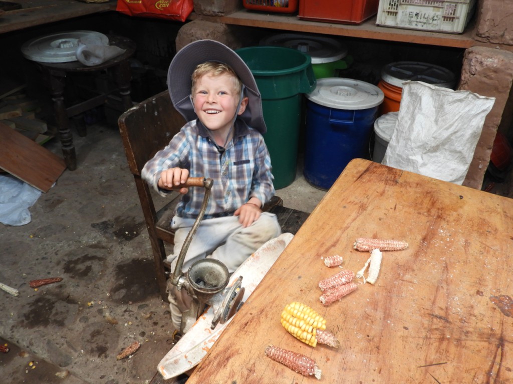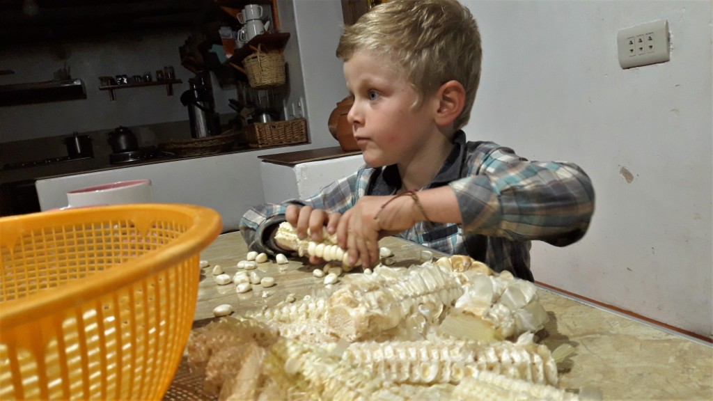 Et on attend chaque jour avec impatience, les repas délicieux et roboratifs d’Alicia ! Pour pallier à la crise et à l’absence de revenus liés au tourisme, la famille tente, autant que possible, de vivre en autosuffisance. Ils dépendant encore du lait, du beurre, du fromage, des œufs (les poules sont jeunes), du riz, des pâtes et de la farine de blé achetés en quantité industrielle au marché pour nourrir tout ce beau monde. Mais pour leur reste, nous mangeons les fruits, les légumes, le maïs et bientôt la viande de la maison, le tout cultivé sans aucun produit phytosanitaire.