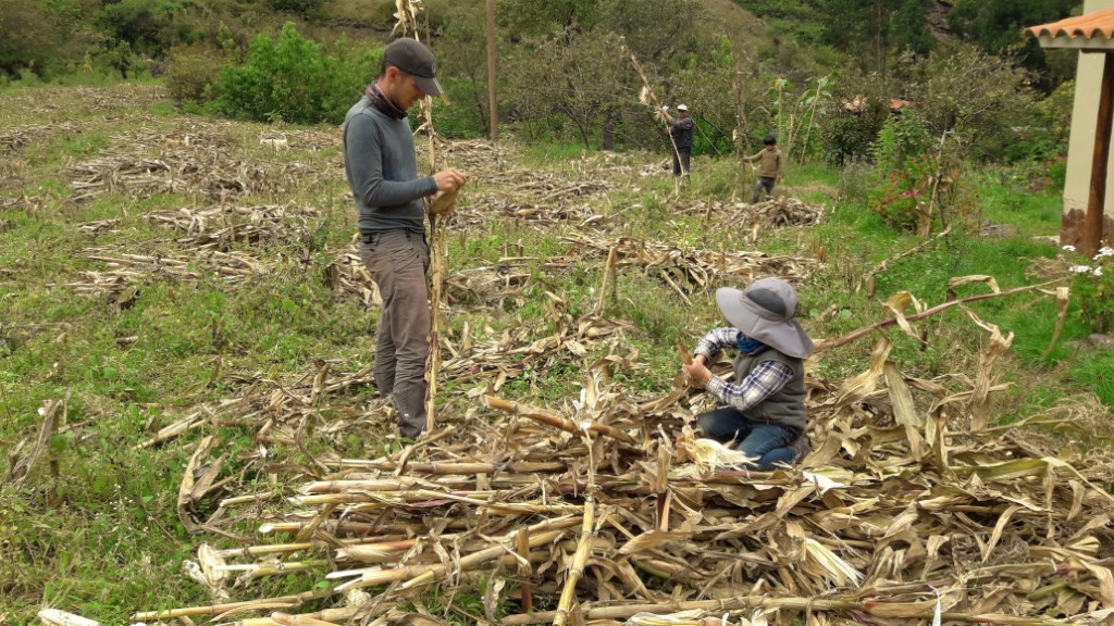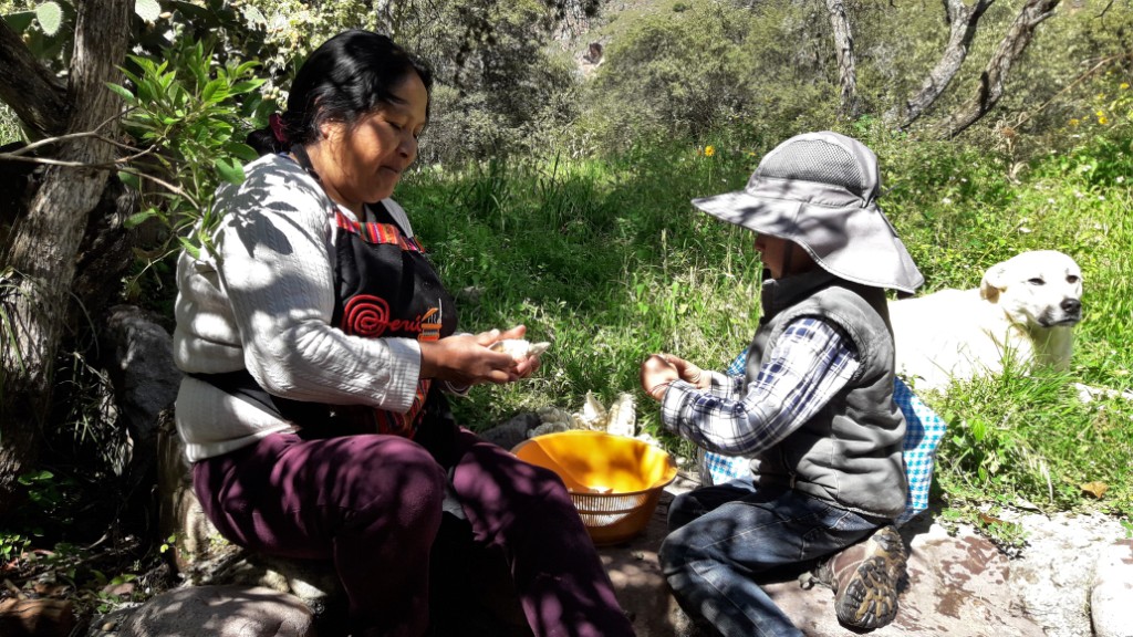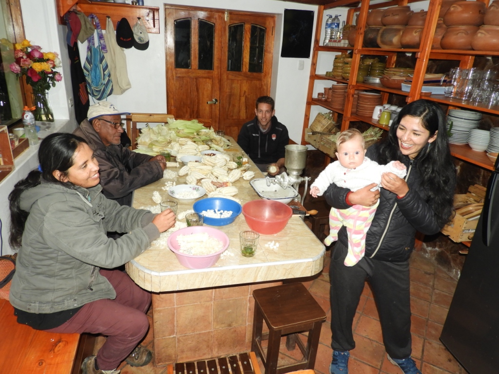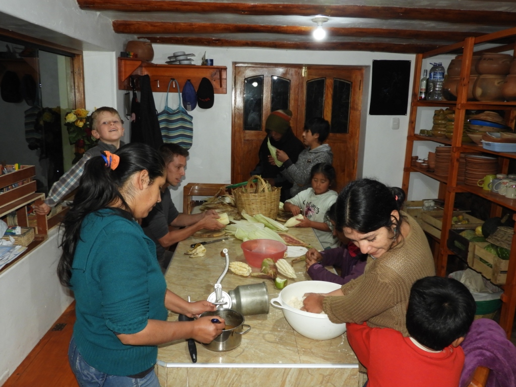 Et quand la nuit tombe, on poursuit dans la cuisine : on égraine, on pèle et on mout le maïs pour en faire des pasteles de choclo (gâteau de maïs) et des humintas (pâte de maïs mélangée à du fromage, cuite à la vapeur dans les feuilles de maïs). Du maïs, du maïs et encore… du maïs ! Mais on travaille dans la joie et la bonne humeur, on fait connaissance… On se sent bien !