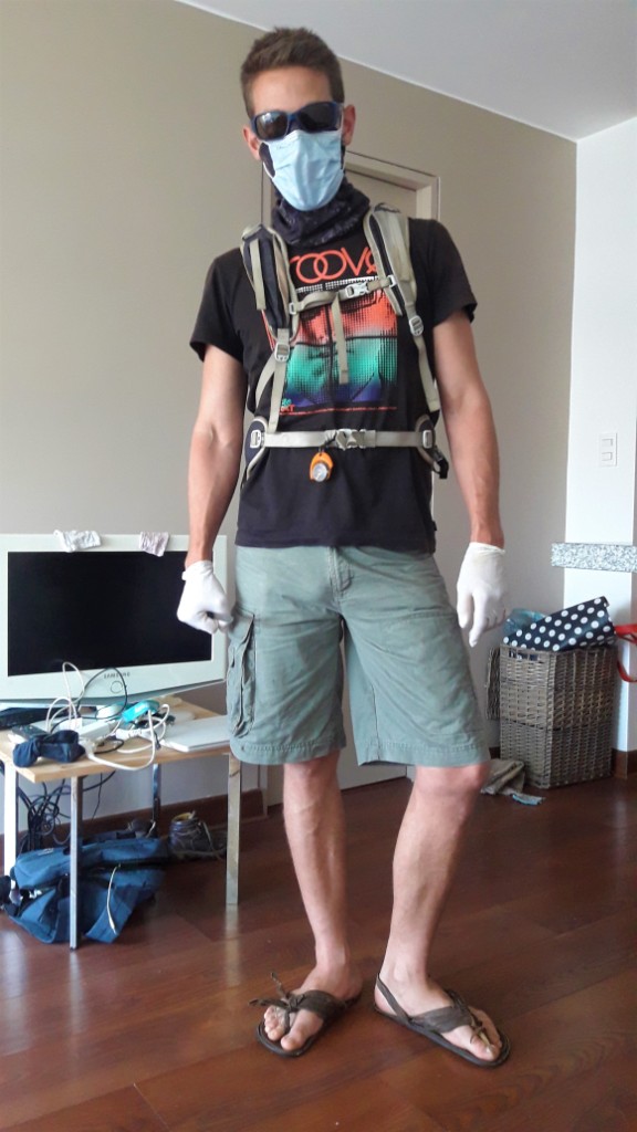 La réglementation liée au confinement se durcit et il n’est même plus autorisé de se rendre en voiture faire des courses. Nous devons acheter proche de là où l’on se trouve et s’y rendre à pied ! Le port du masque est obligatoire. Hugo doit donc faire preuve d’astuce pour remonter le dénivelé avec son lourd chargement sur plus d’1 km.
