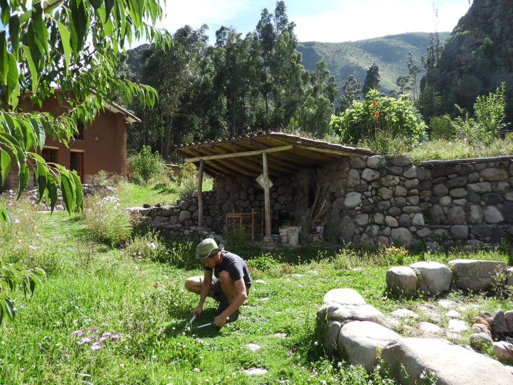 Finalement, nous nous rendons dans l’éco-lodge d’une amie à lui, se trouvant de l’autre côté de la panaméricaine, dans les hauteurs du même village. Nous louons une chambre et la gérante met à notre disposition une gazinière. Nous négocions le prix en échange d’une participation à l’entretien du superbe espace vert et du potager présents sur place.