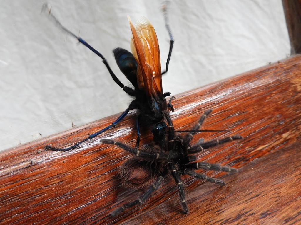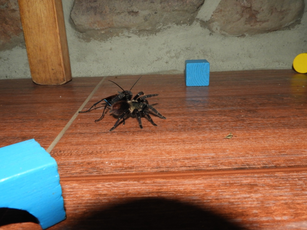 L’endroit est assez sauvage et la nature aussi est farceuse. Un étrange ballet macabre s’invite au milieu des jouets de Léon. Un énorme insecte ailé a attrapé une tarentule et a l’air bien décidé à en faire son casse-croute. Le spectacle est impressionnant !