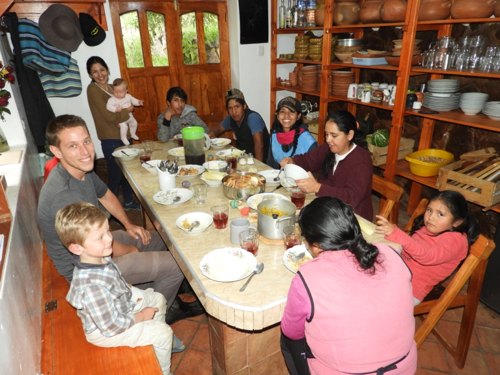 L’ambiance n’étant pas très joviale et le prix encore assez élevé dans cet endroit, Hugo se met à nouveau en quête d’un autre refuge. Il contacte la propriétaire d’une auberge située à 400 mètres de là par le biais d’Airbn’b. Tania se concerte longuement avec sa grande famille et les dirigeants de son village et finit par accepter de nous recevoir dans son havre de paix. Nous sommes reçus à bras ouvert par Papa Mario, ses 3 filles Tania, Naywitay et Tuki, ses 2 petits-enfants Joachin et Alba, les jeunes de communautés indigènes vivant sous son toit et Alicia, la cuisinière. En échange d’un loyer et de notre aide aux tâches quotidiennes, ils nous offrent le gîte et le couvert que nous partageons avec eux comme des membres de leur famille…