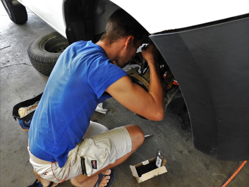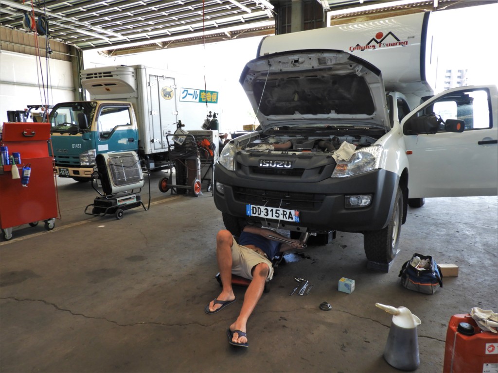 Avant de nous engager dans la montagne, on fait un stop dans un garage Isuzu qui met gentiment ses locaux et son matériel à notre disposition. Au programme, vidange, filtres et changement des freins. Merci à toute l’équipe pour le sympathique coup de main !