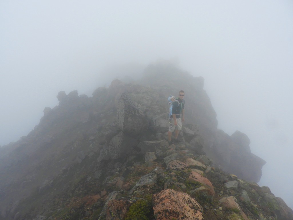 La belle promenade de santé se transforme vite en galère dans la neige et le brouillard. On empreinte un chemin de traverse qui nous mène à une corniche très raide mais on parvient tout de même à toucher le sommet.
