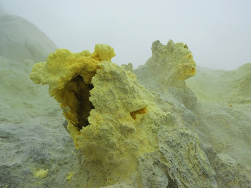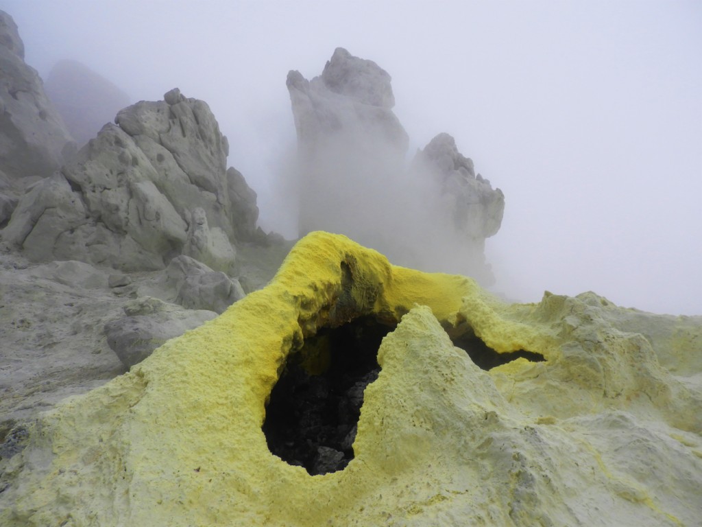 Le lac acide qui remplit le cratère est malheureusement invisible. On est tout de même impressionné par la puissance et la chaleur des émanations de souffre sortant de ces bouches ouvertes sur les entrailles de la terre.