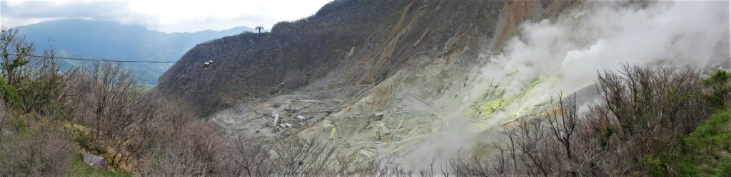 Une fois la date de notre shipping fixé et nos billets d’avion pris, on se rend sur la péninsule d’Izu. En chemin, on fait un arrêt à Hakone pour aller voir la terre cracher ses fumerolles au sommet du volcan surplombant le lac Ashi. Le paysage est une fois de plus gâché par les installations humaines et la masse de touriste.