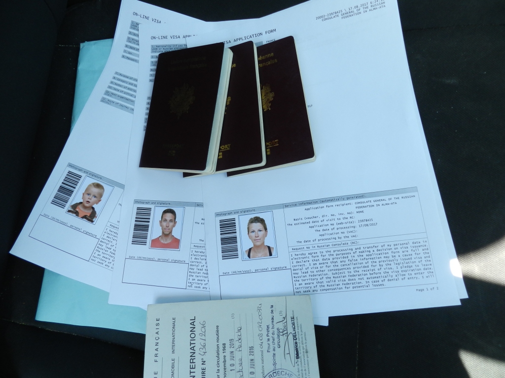 La procédure pour le visa de transit est assez simple : il faut se rendre à l’ambassade, ouverte le mardi de 10h à 12h et le vendredi de 15h à 17h, muni des originaux et photocopies des passeports, carte grise du véhicule, permis de conduire, carte d’immigration kazakh (petit papier remis à la frontière), d’un formulaire signé (à remplir sur l’application https://visa.kdmid.ru/), d’une photo d’identité et (le plus compliqué à obtenir si on ne s’y est pas pris à l’avance), d’un original d’attestation d’assurance santé mentionnant votre couverture sur le territoire russe pendant les dates de votre séjour. Ceci dit, nous avons remis une copie et ils ne nous ont jamais demandé de leur montrer l’original. 7 jours et 35 dollars plus tard, vous obtenez votre visa. Si vous êtes pressé, vous l’avez en 72h pour 70 dollars.