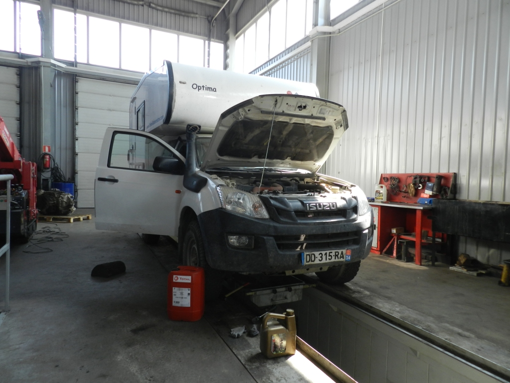 Un séjour chez Isuzu s’impose aussi. Notre problème de FAP persiste et signe ! On récupère des pièces de rechanges et on nous laisse accès à l’atelier pour faire vidange et remplacements des filtres (air, huile, diesel et habitacle). Un grand merci à toute l’équipe d’Isuzu qui nous a, une fois de plus, beaucoup aidés et tout particulièrement à Kaisar, commercial francophone !