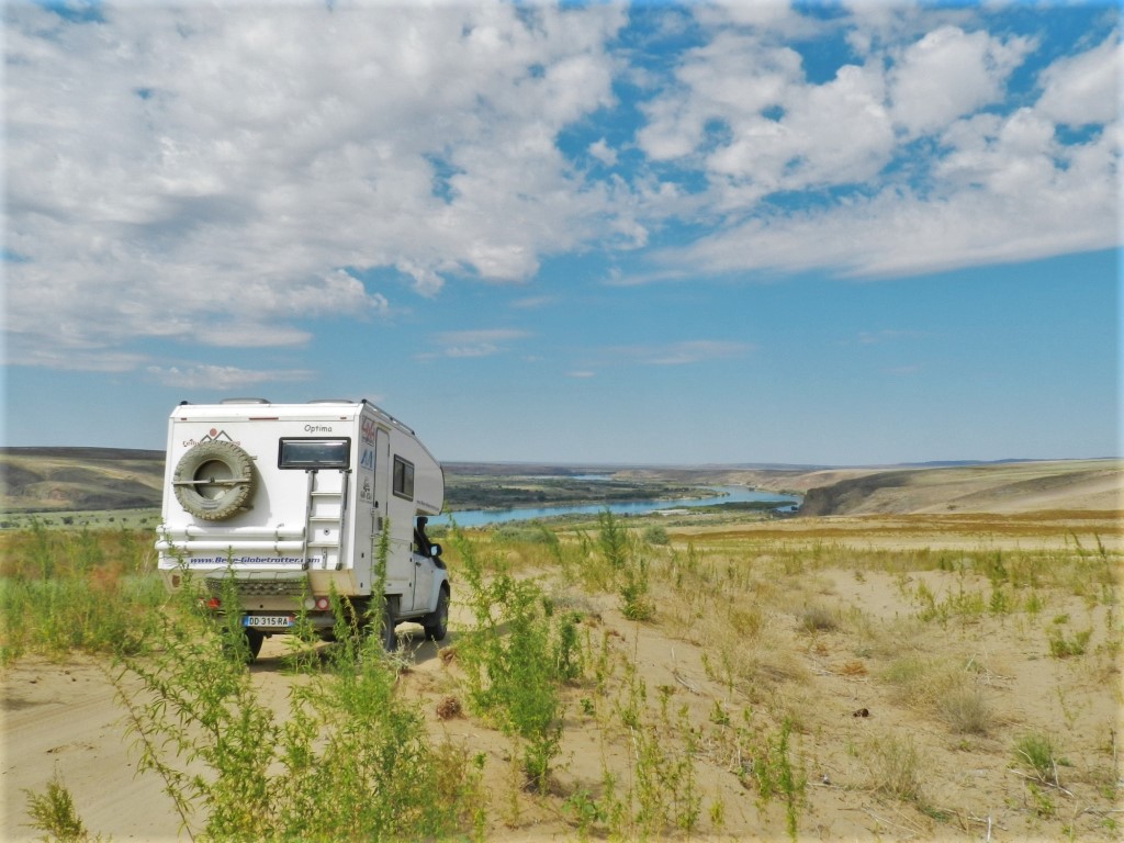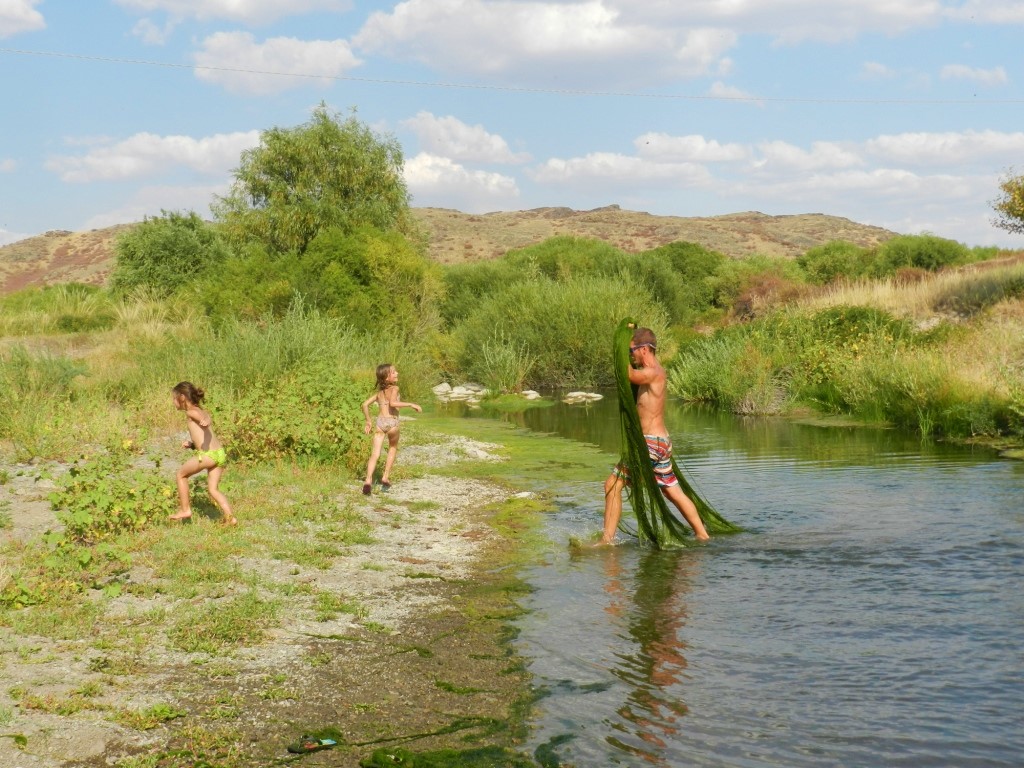 On ne se quittera plus pendant les 3 jours qui suivront. Entre les heures de route dans la steppe (longues et rébarbatives niveau paysage), on fait des pauses rivières où Hugo chahute avec les filles (qui le lui rendent bien). Batailles d’algues puantes et « tours de manèges » sont au programme…