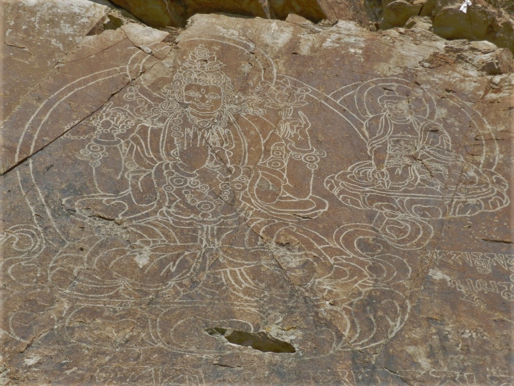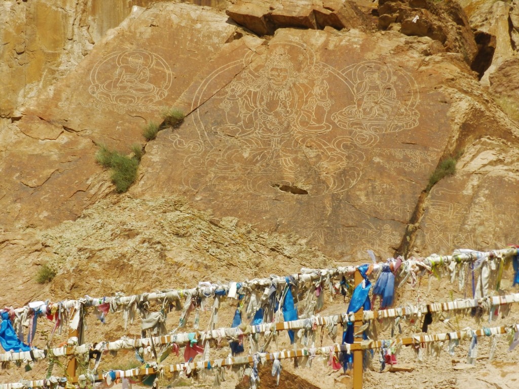 On commence notre immersion dans la culture bouddhiste grâce aux pétroglyphes tibétains que l’on peut admirer au bord de la rivière.