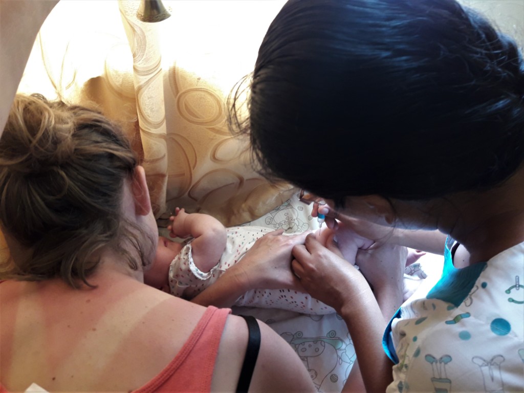 Notre Margaux fête déjà ses 2 petits mois et avec cela, le droit à ses premiers vaccins… Nous nous rendons dans un centre de santé où le personnel réalise de manière très professionnel ses premières injections obligatoires.