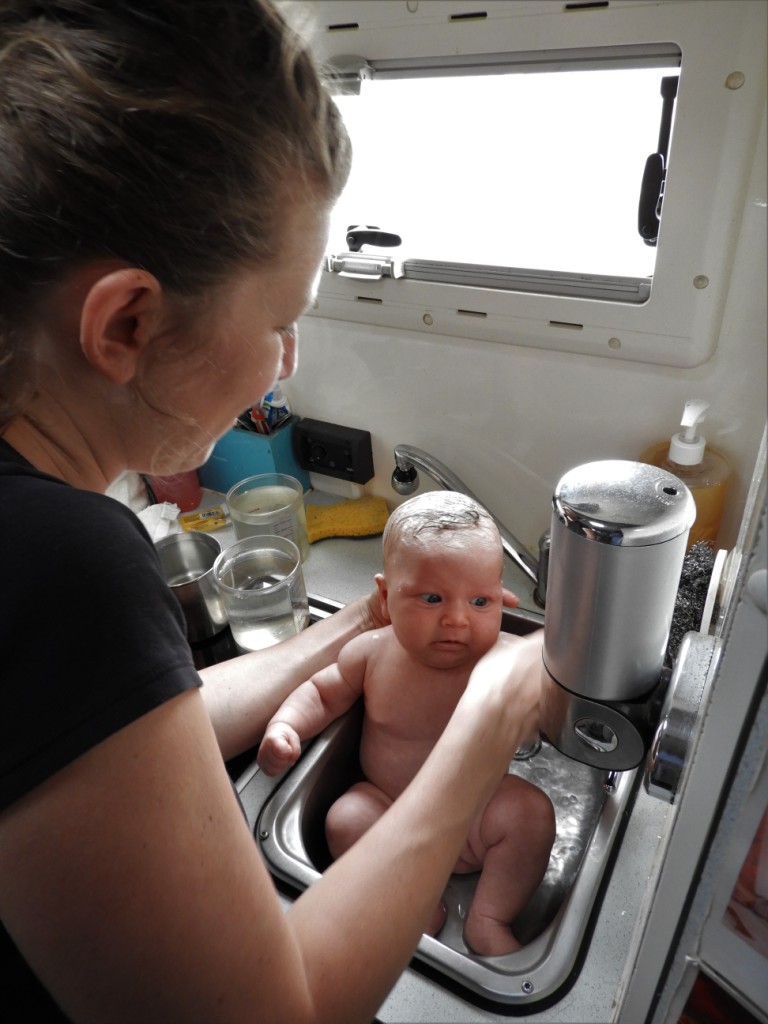 Nous nous réinstallons enfin dans la cellule et entamons les démarches auprès des douanes pour prolonger notre permis d’importation temporaire. Léon profite pleinement de sa sœur pendant que ses parents tentent avec elle, de nouvelles expériences, à noter le bain dans l’évier et la préparation d’itinéraire avec bébé.