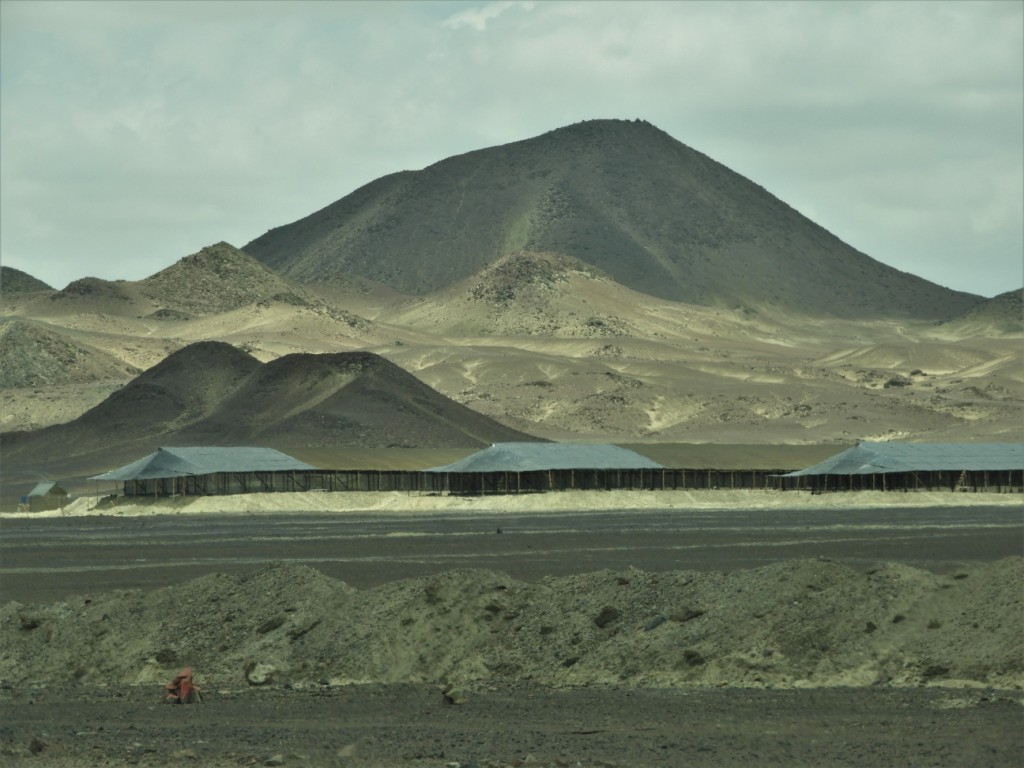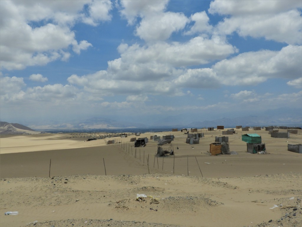 Nous retournons vers la route panaméricaine par le biais d’une très mauvaise piste cahoteuse servant de dépotoir battu par les vents et de siège aux élevages de poulets à grande échelle. Les pauvres bêtes sont entassées dans de petites cages qui ne touchent pas le sol et sont tout juste protégées de la chaleur ardente par des bâches. Beaucoup moins charmant… Les quelques villages traversées ont des allures de bidonville dont les maisons prennent l’allure d’abris sommaires.