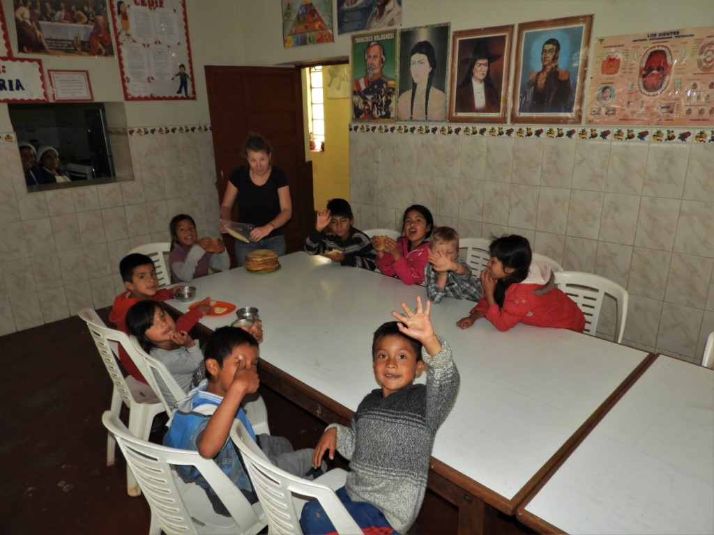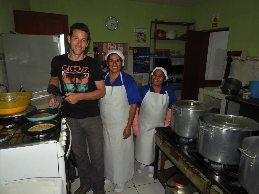Le lendemain matin, Hugo se lance dans la confection d’environ 120 crêpes que nous distribuons aux 80 enfants ainsi qu’au personnel. C’est un franc succès pour la spécialité bretonne que beaucoup n’avaient jamais eu l’occasion de goûter !