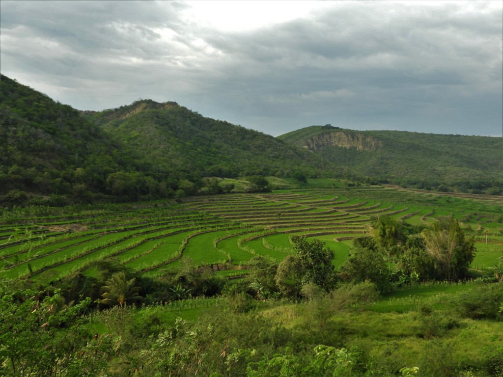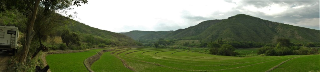 Après une route chaotique pour quitter l’Equateur et entrer au Pérou, nous arrivons dans les environs de San Ignacio, versant oriental de la Cordillère des Andes. De ce côté, les reliefs sont relativement doux et le climat plutôt chaud et humide est favorable à la culture du riz. A l’occasion de petits détours fortuits, nous rencontrons de superbes paysages de rizières…
