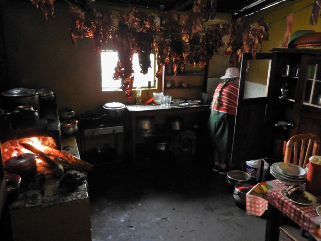 Nous trouvons tout de même un minuscule bouiboui pour manger où l’on nous sert du porc de la maison conservé en tranches fines pendues dans la cuisine et « fumées » par les émanations du poêle à bois.