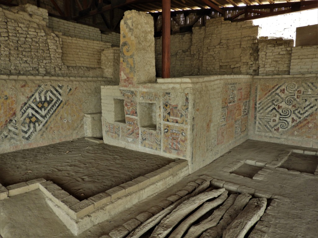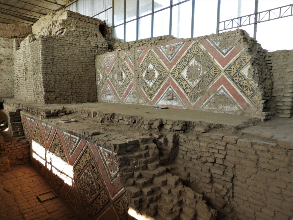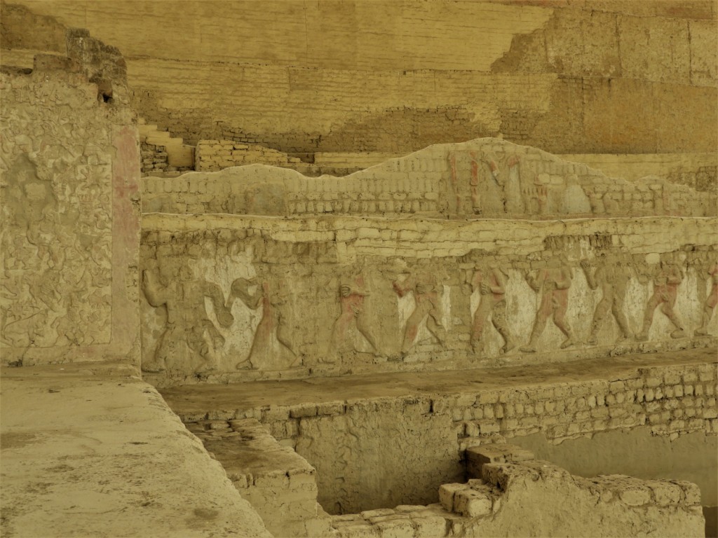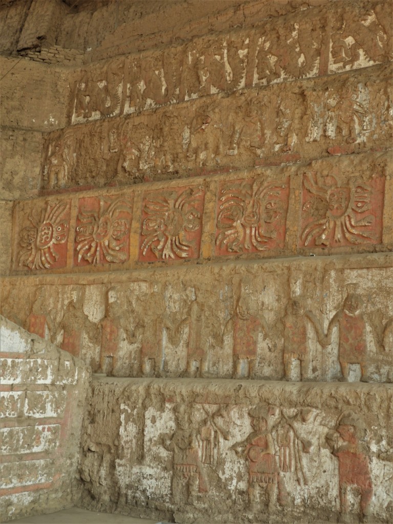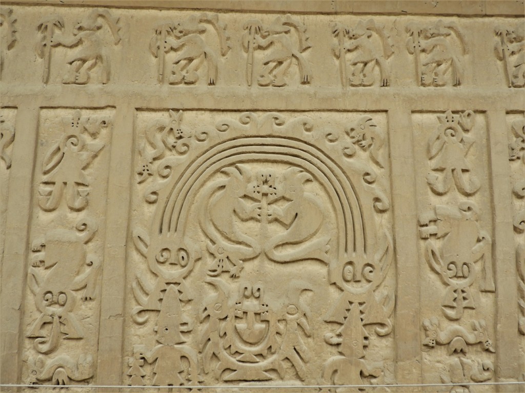 A Trujillo, nous allons nous perdre dans le labyrinthe de sable de la cité Chímu de Chan Chan. Entre 850 et la conquête par les Incas au XVème siècle, la civilisation Chímu a bâti un royaume sur les ruines de la civilisation Moche, avec Chan Chan pour capitale ainsi que de nombreuses huacas dispersées aujourd’hui dans toute la ville moderne. Un brin déçus par le site principal très restauré, paraissant peu authentique, la huaca del dragon ou arco iris (arc en ciel), offre elle de très beaux bas-reliefs taillés dans l’adobe.