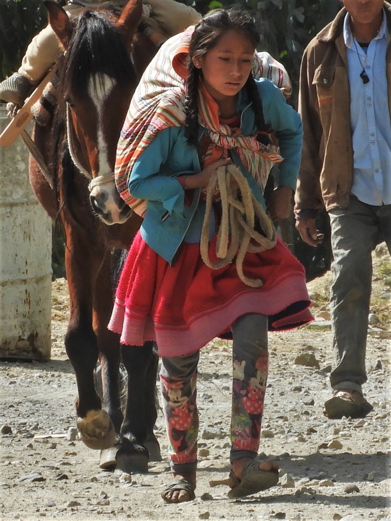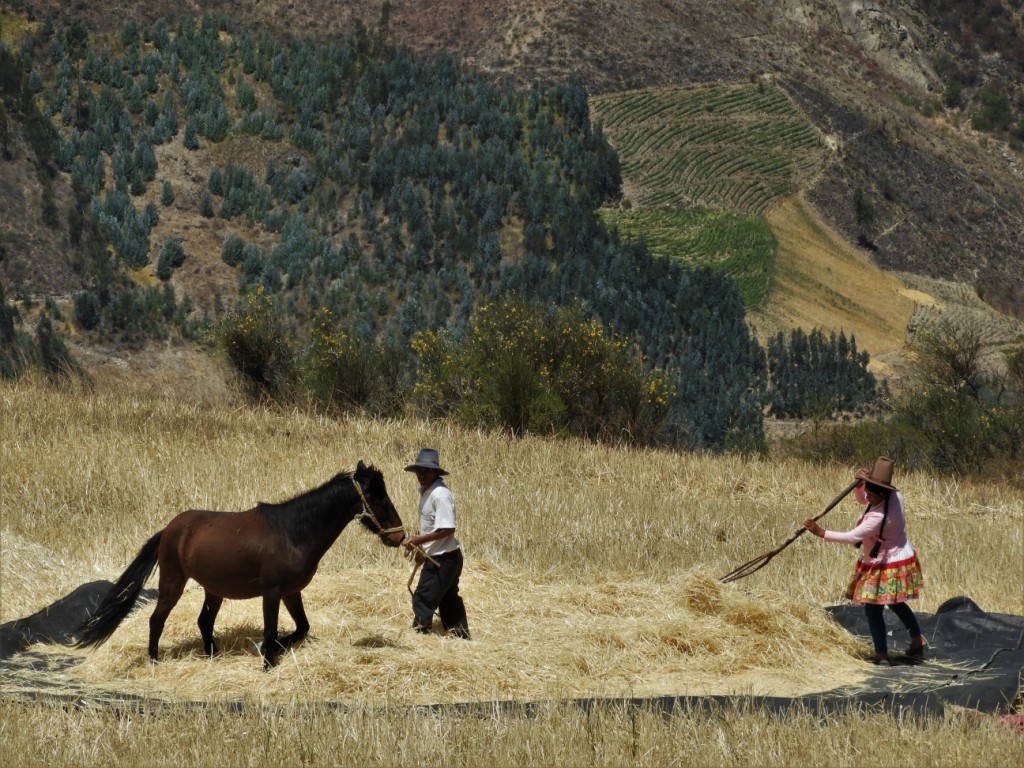 Nous redescendons la route abrupte et pittoresque qui mène à la vallée d’Utcubamba. En chemin, nous croisons les locaux affairés au ramassage des patates transportées ici à dos de mules.