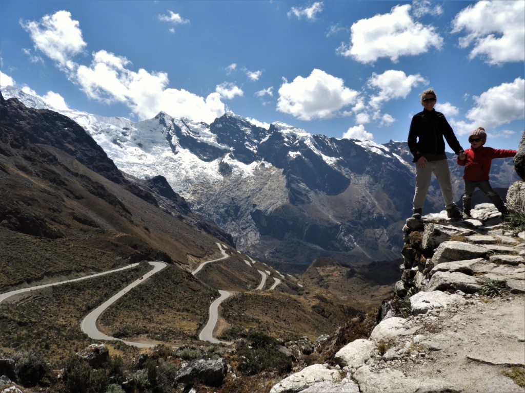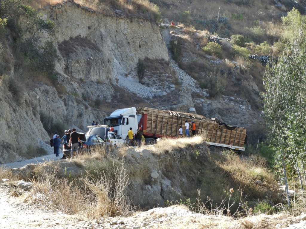 Nous redescendons vers la ville de Caraz, reprenons la route principale vers le sud puis bifurquons à nouveau vers l’est et la cordillère pour entrer dans le parc national de Huascaran, qui tient son nom du plus haut pic de la cordillère et du pays qui culmine à 6768m d’altitude. La piste est en piteuse état. Les secousses commencent à être un peu plus difficiles à supporter pour Elo et sa « pancita » croissante. Après quelques dizaines de km, nous nous heurtons à un obstacle de taille : un camion rempli de bois n’arrive pas à passer et bloque toute la circulation. Signe du destin, nous rebroussons chemin.