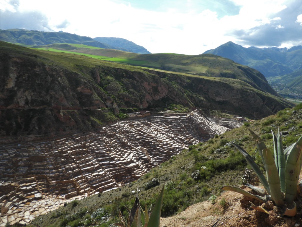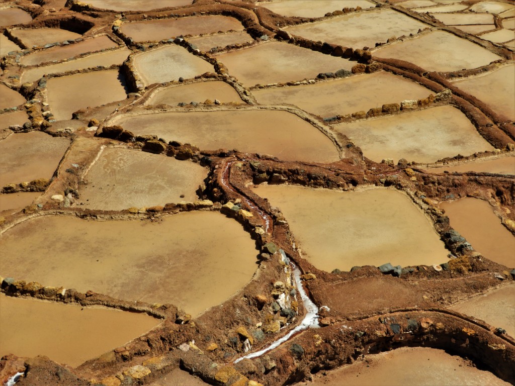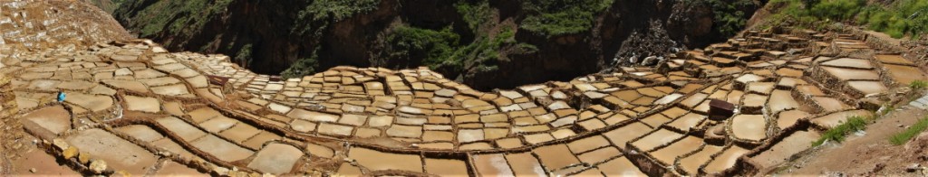 Des milliers de bassins construits en étages à flanc de falaise se remplissent grâce à une source salée puis sont laissés à sécher avant d’y récolter le sel. Un site déjà exploité par des peuples pré-incas…