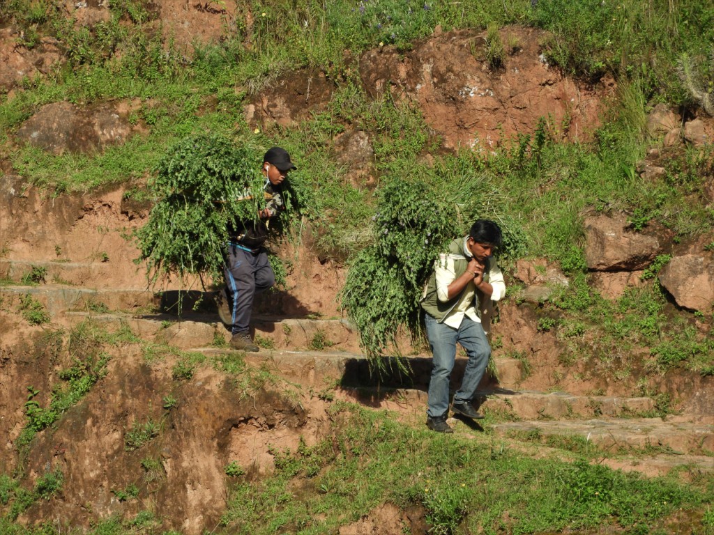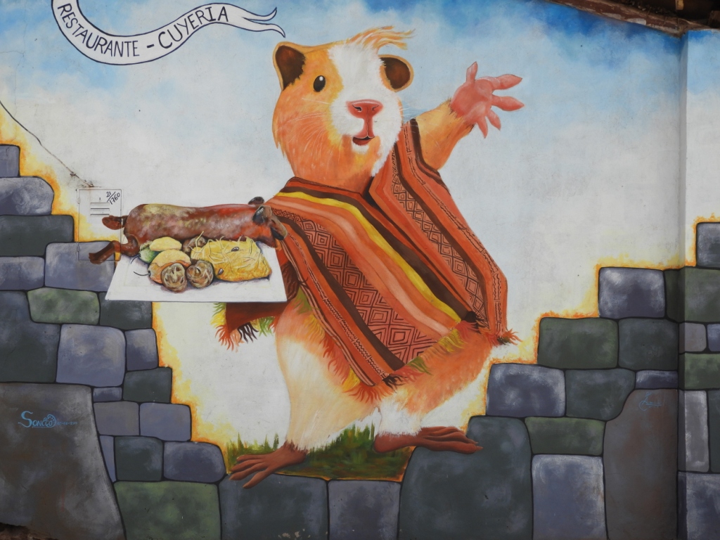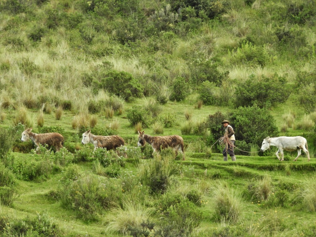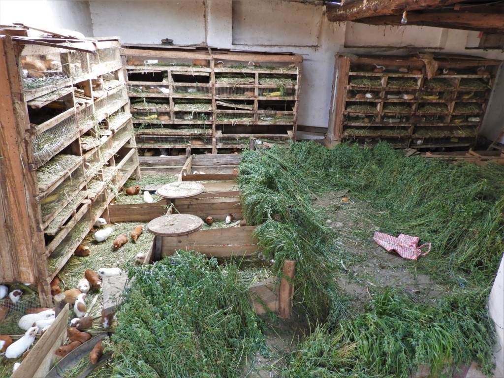 A l’occasion de notre bivouac, nous faisons la connaissance d’Uña, curieux de l’observer lui et ses collègues transporter d’énormes et lourdes botes d’herbes fraîches. Il nous explique alors qu’elles serviront à nourrir ses cuyes (cochons d’Inde) qu’il élève pour la consommation. On ne manque pas de se faire inviter à visiter cette exploitation dès le lendemain ! Les animaux sont très bien traités, bien nourris, ne nécessitent ni hormones, ni antibiotiques. Ils ont même de la musique en continue pour leur éviter d’être effrayés par les bruits extérieurs. Le résultat donne une viande très saine et sans cholestérol (mais évidemment coûteuse !) que l’on s’empresse d’aller déguster dans l’un des nombreux restaurants alentour…